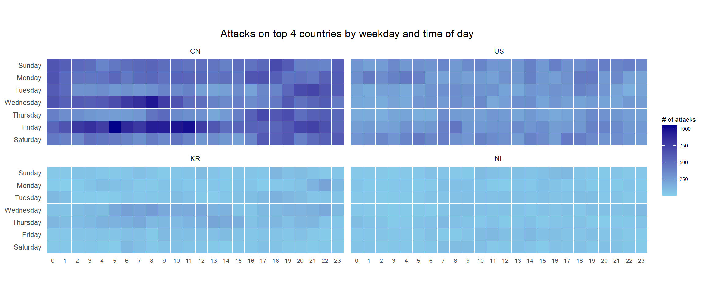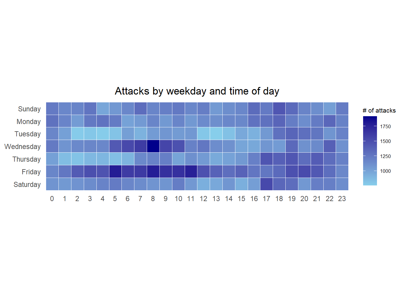 Note: Beside extracting the necessary data into attacks data frame, mutate() of dplyr package is used to convert wkday and hour fields into factor so they’ll be ordered when plotting