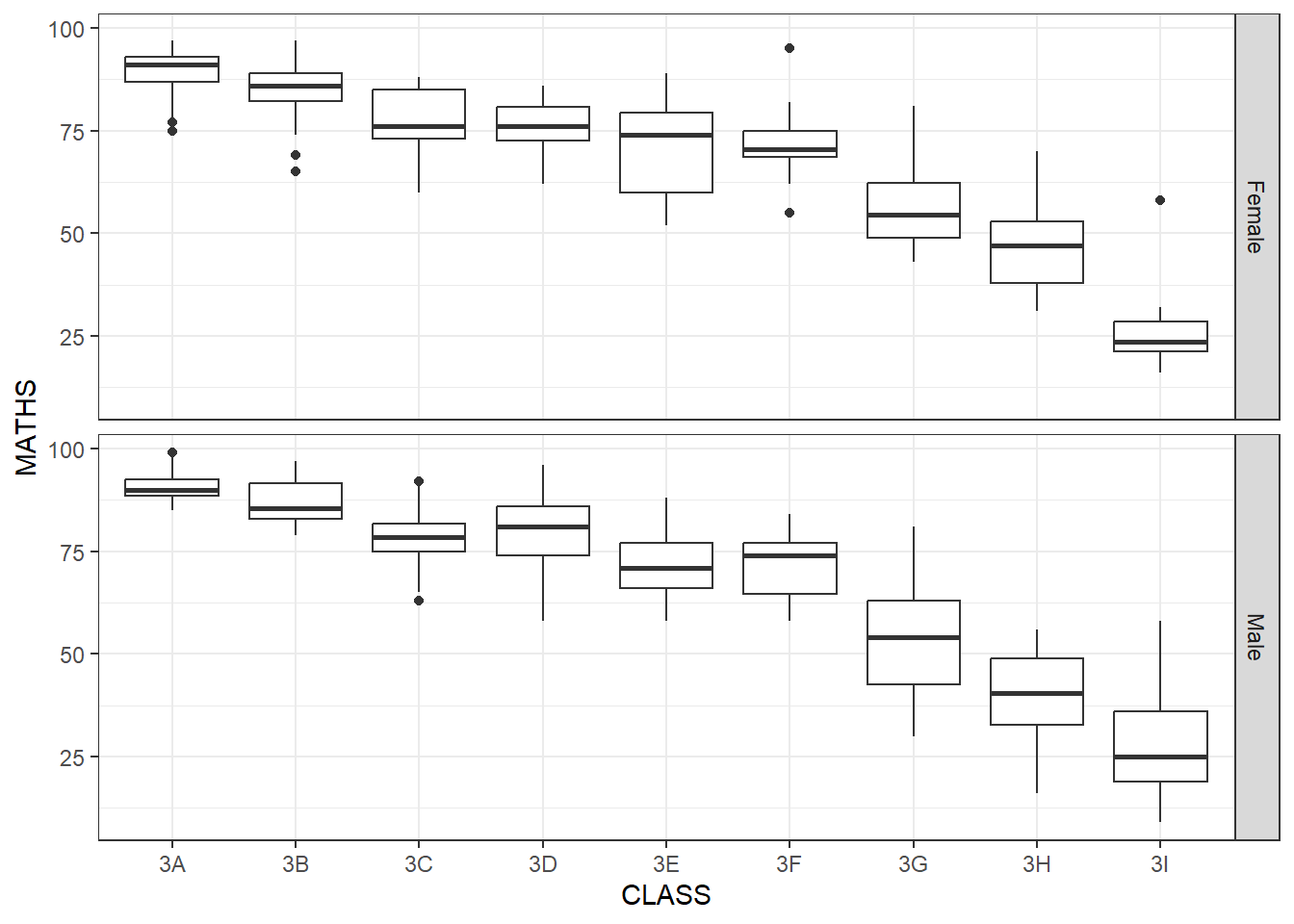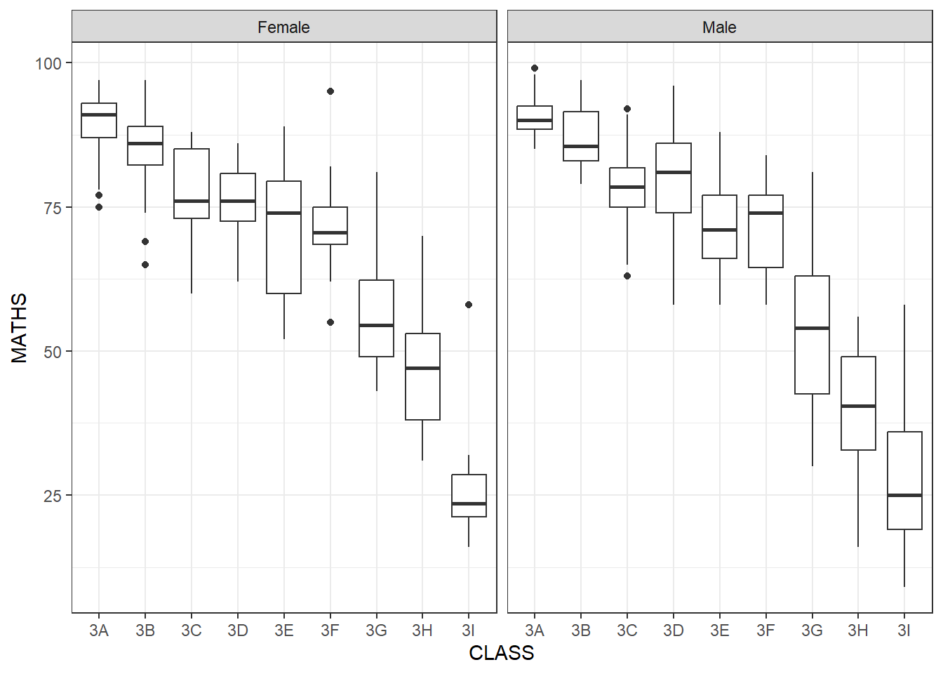 ggplot(data = exam_data, aes(y = MATHS, x = CLASS)) +