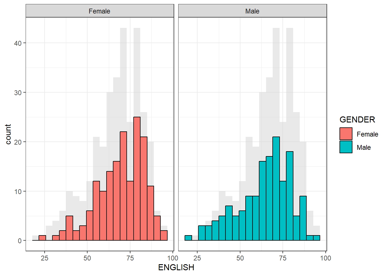 ###WHAT IF WE PLOT TWO geom_histogram at the same time, but we use fill= Gender and use facet_grid to seperate them by gender### The overall entire ENGLISH score lightgrey color is in the background, however, the 2nd histogram is filled with aes(fill= GENDER) and facet_grid seperate them into 2 diagrams Without this facet_grid, 2 geom_histogram will basically plot the same data and the lightgrey graph will not appear.