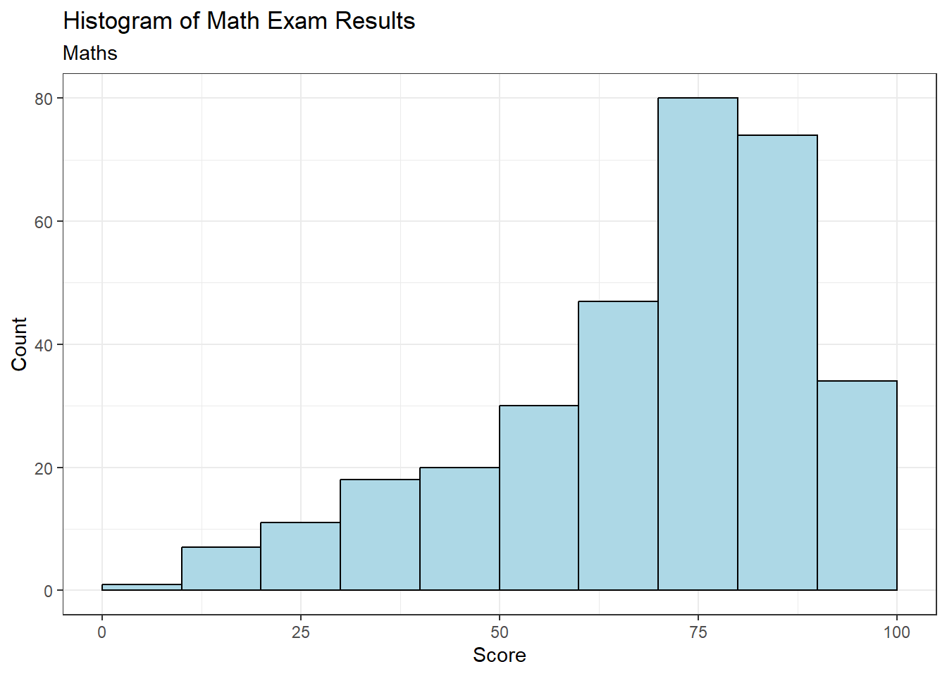 View Math Result using ggplot2 histogram, notice the smaller number of bins