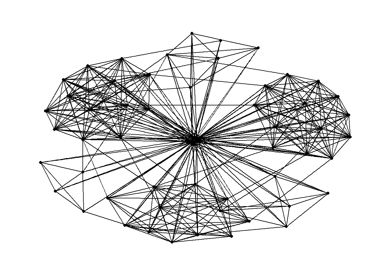 g <- ggraph(GAStech_graph) + geom_edge_link(aes()) + geom_node_point(aes()) g + theme_graph()