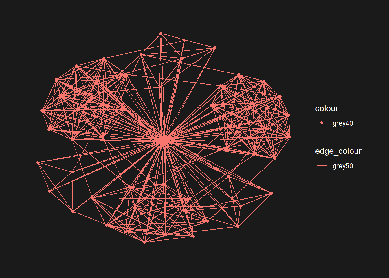 g <- ggraph(GAStech_graph) + geom_edge_link(aes(colour = 'grey50')) + geom_node_point(aes(colour = 'grey40')) g + theme_graph(background = 'grey10', text_colour = 'white')