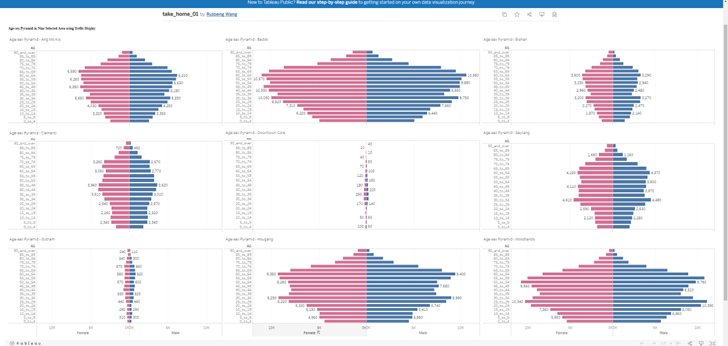 In the first task, we are supposed to create Age-sex Pyramid to cover 9 planning areas of Singapore in term of Male/ Female and the age group.