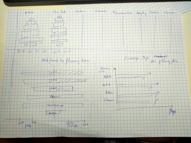 Clarity: The viz was created for 9 planning areas with 9 different populations. However, they use to same absolute scales in terms of number of people. Therefore, the areas with small number of populations ( Downtown Core and Outram) when putting in the same x-axis scale as other areas, does not have high enough number of people, to show case the distributions as Age-sex pyramid.